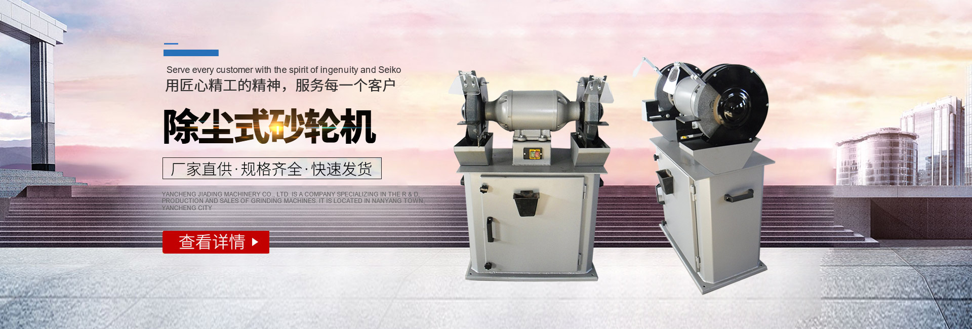 鹽城嘉鼎機械有限公司是一家專業從事砂輪機研發、生產、銷售為一體的公司,坐落在鹽城市南洋鎮。主要產品有:砂輪機、砂帶機等系列。其中砂輪機有:臺式、立式、懸掛式、除塵式、它驅式、防爆式等三十多個規格品種,也可定制特殊行業所需的異型砂輪機。